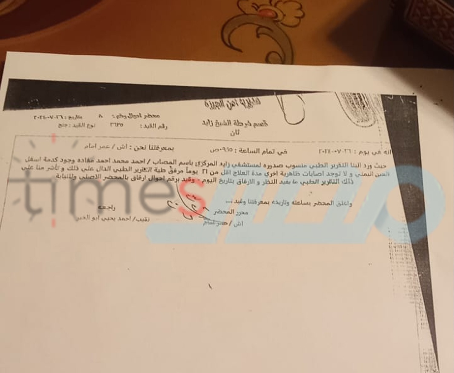 وتضمن التقرير الطبي الخاص بحالة المجني عليه مدير مركز صيانة السيارات: التقرير منسوب صدوره لمستشفى زايد المركزي باسم المصاب "أحمد. م. أ"، مفاده وجود كدمات أسفل العين اليمنى ولا توجد إصابات ظاهرية أخرى.