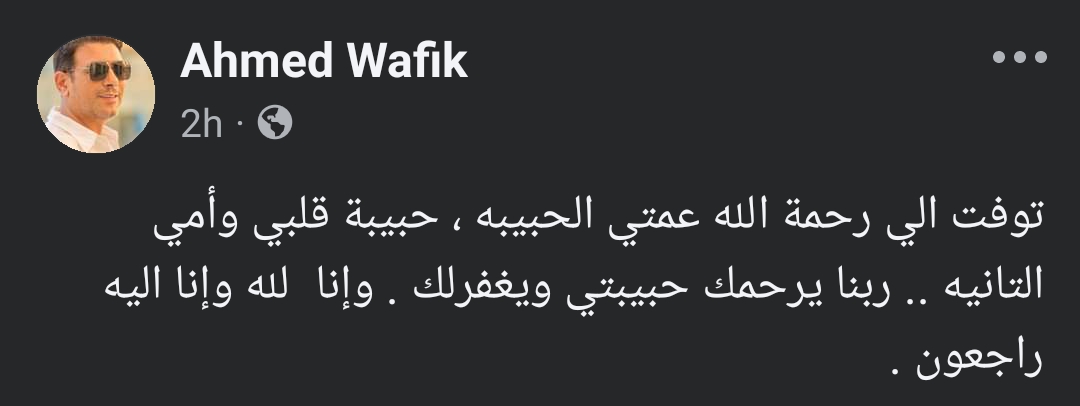 كتب أحمد وفيق منشورا على صفحته الرسمية عبر موقع التواصل الاجتماعي "فيسبوك" وعلق قائلا : "توفت الي رحمة الله عمتي الحبيبه ، حبيبة قلبي وأمي التانيه .. ربنا يرحمك حبيبتي ويغفرلك . وإنا لله وإنا اليه راجعون ".