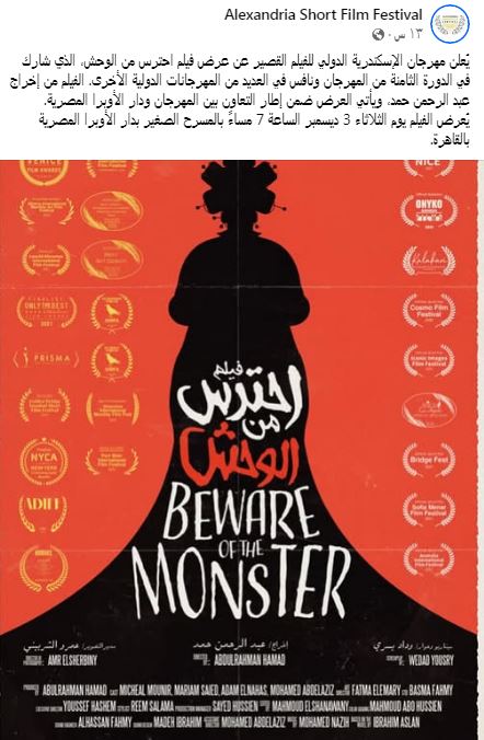 أعلنت الصفحة الرسمية لـ مهرجان الإسكندرية للفيلم القصير عن عرض فيلم" احترس من الوحش" بدار الأوبرا المصرية .