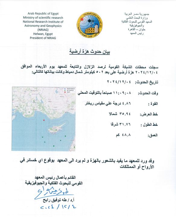 أعلن المعهد القومي للبحوث الفلكية في بيان له أن محطات الشبكة القومية لرصد الزلازل والتابعة للمعهد سجلت يوم الأربعاء الموافق 4/12/2024 هزة أرضية على بعد 502 كيلو متر شمال دمياط وكانت بقوة 4,86 درجة بمقياس ريختر .