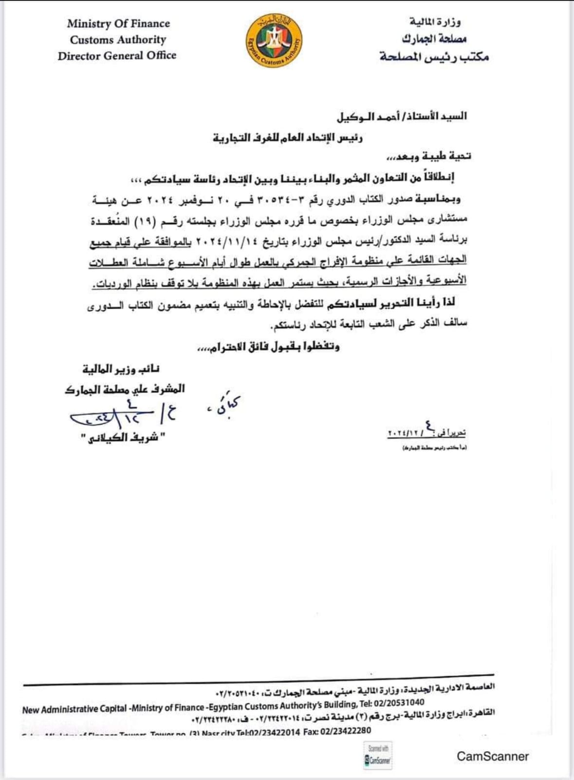 في خطوة غير مسبوقة تعكس حرص الدولة على دعم الاقتصاد الوطني وتسهيل حركة التجارة، صدر الكتاب الدوري رقم ٣٠٥٣٤/٣ في ٢٠ نوفمبر ٢٠٢٤ عن هيئة مستشارى مجلس الوزراء بخصوص ما قرره مجلس الوزراء بجلسته رقم (۱۹) المنعقدة برئاسة الدكتور/ رئيس مجلس الوزراء بتاريخ ۲۰۲٤/۱۱/۱٤ بالموافقة على قيام جميع الجهات القائمة على منظومة الإفراج الجمركي بالعمل طوال أيام الأسبوع شاملة العطلات الأسبوعية والأجازات الرسمية، بحيث يستمر العمل بهذه المنظومة بلا توقف بنظام الورديات.