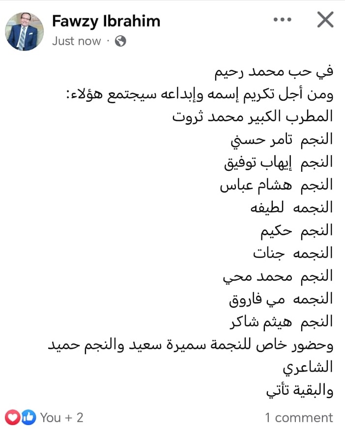 وكتب إبراهيم "من أجل تكريم اسمه وابداعه سيجتمع هؤلاء: النجوم تامر حسني، إيهاب توفيق، هشام عباس، لطيفة، حكيم، جنات، محمد محيي، هيثم شاكر، مي فاروق، وحضور خاص للنجمة سميرة سعيد والنجم حميد الشاعري، والبقية تأتي".