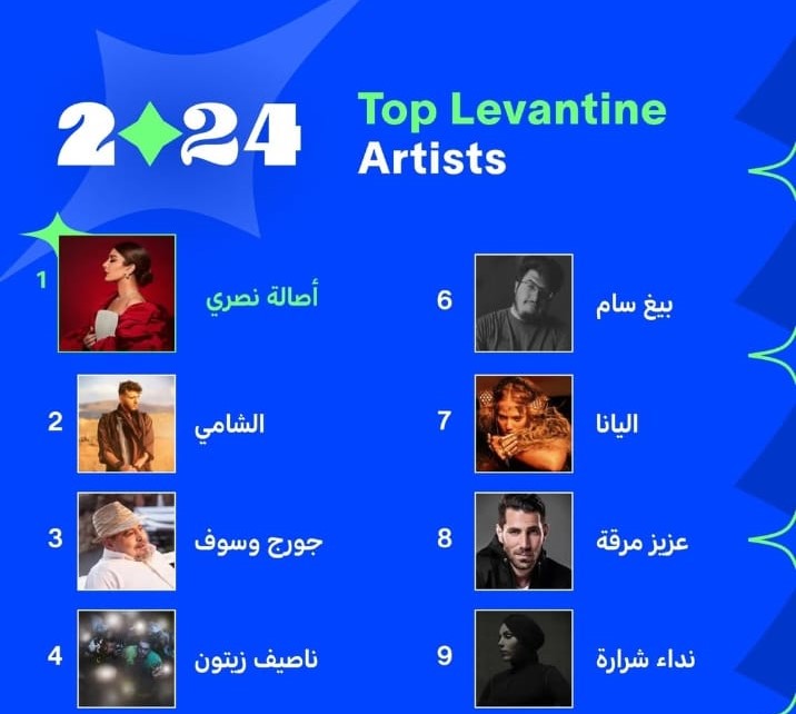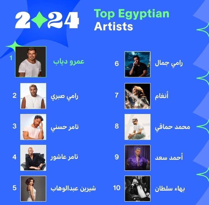 في القائمة المصرية تصدر النجم عمرو دياب للعام السابع على التوالي قائمة الفنانين العرب الأكثر استماعاً على المنصة في 2024؛ ليحصل على أفضل فنان عربي وأفضل ألبوم، كما تصدرت أغنية «مكانك» قوائم الأغاني الأعلى استماعًا على المنصة، فيما جاء في المركز الثاني المطرب رامي صبري، تلاه تامر حسني، تامر عاشور، شيرين عبدالوهاب، رامي جمال" وتزيل قائمة الــ TOP 10 بهاء سلطان في المركز العاشر وأحمد سعد في المركز التاسع.
