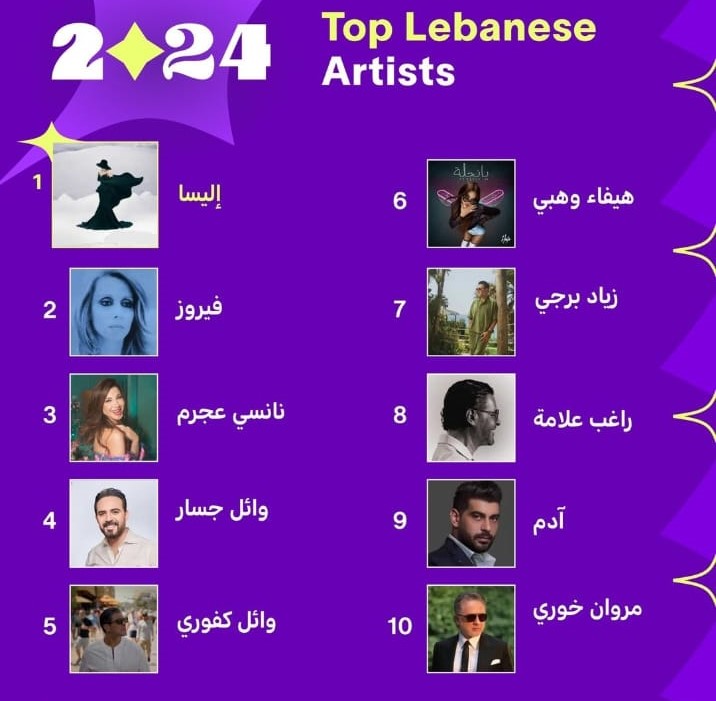 وتصدرت إليسا القائمة اللبنانية من حيث الفنانيين الأكثر استماعاً، وجاء في المرتبة الثانية النجمة الكبيرة فيروز،أما المركز الثالث فكان من نصيب نانسي عجرم، وفي الرابع والخامس وائل جسار ووائل كفوري، وتزيل القائمة في المركز العاشر مروان خوري.