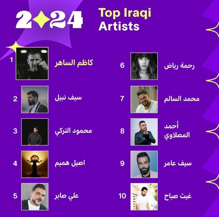 وعلى الصعيد العراقي فلم يهبط النجم الكبير كاظم الساهر من قائمة الفنان الأعلى استماعاً لأكثر من خمسة أعوام حيث تصدر قائمة الــ TOP 10، أما المركز الثاني فمن نصيب سيف نبيل، والثالث محمود التركي، أما المركز العاشر فكان من نصيب المطرب الشاب غيث صباح.