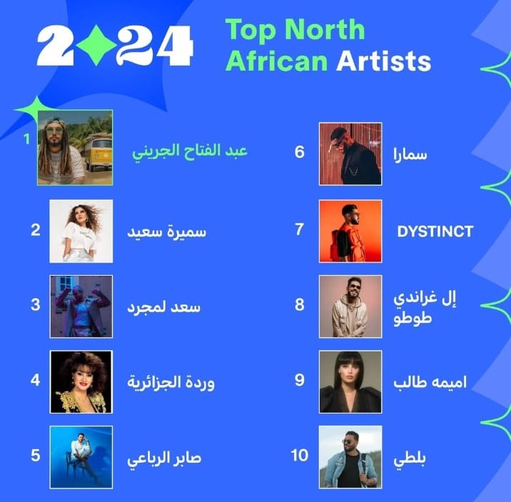 ومن الفنانيين المغاربة تصدر قائمة "شمال أفريقيا" الفنان الأكثر استماعاً النجم المغربي عبدالفتاح الجريني، ومن ثم الديفا سميرة سعيد، والمركز الثالث كان للنجم سعد لمجرد، وتزيل المطرب التونسي بلطي القائمة في المركز العاشر ليحتل بذلك نجوم المملكة المغربية قائمة الأفضل مغاربياً بواقع خمس أشخاص وهم إلى جانب المذكورين مطرب الراب غراني طوطو، والمطرب المغربي البلجيكي إلياس المنصوري المعروف بــــ DYSTINCT.