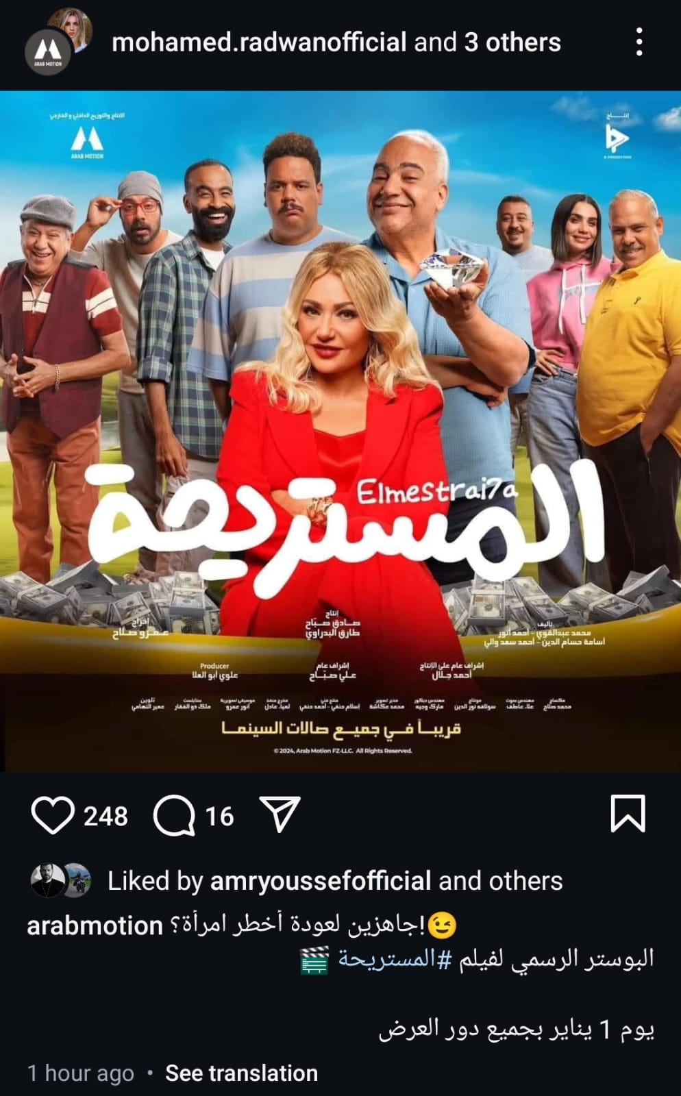 نشرت الشركة المنتجة صورة البوستر الرسمي على الصفحة الرسمية عبر موقع تبادل الصور والفيديوهات "إنستجرام" وعلقت قائلة : "جاهزين لعودة أخطر امرأة، البوستر الرسمي لفيلم المستريحة، يوم 1 يناير بجميع دور العرض" .