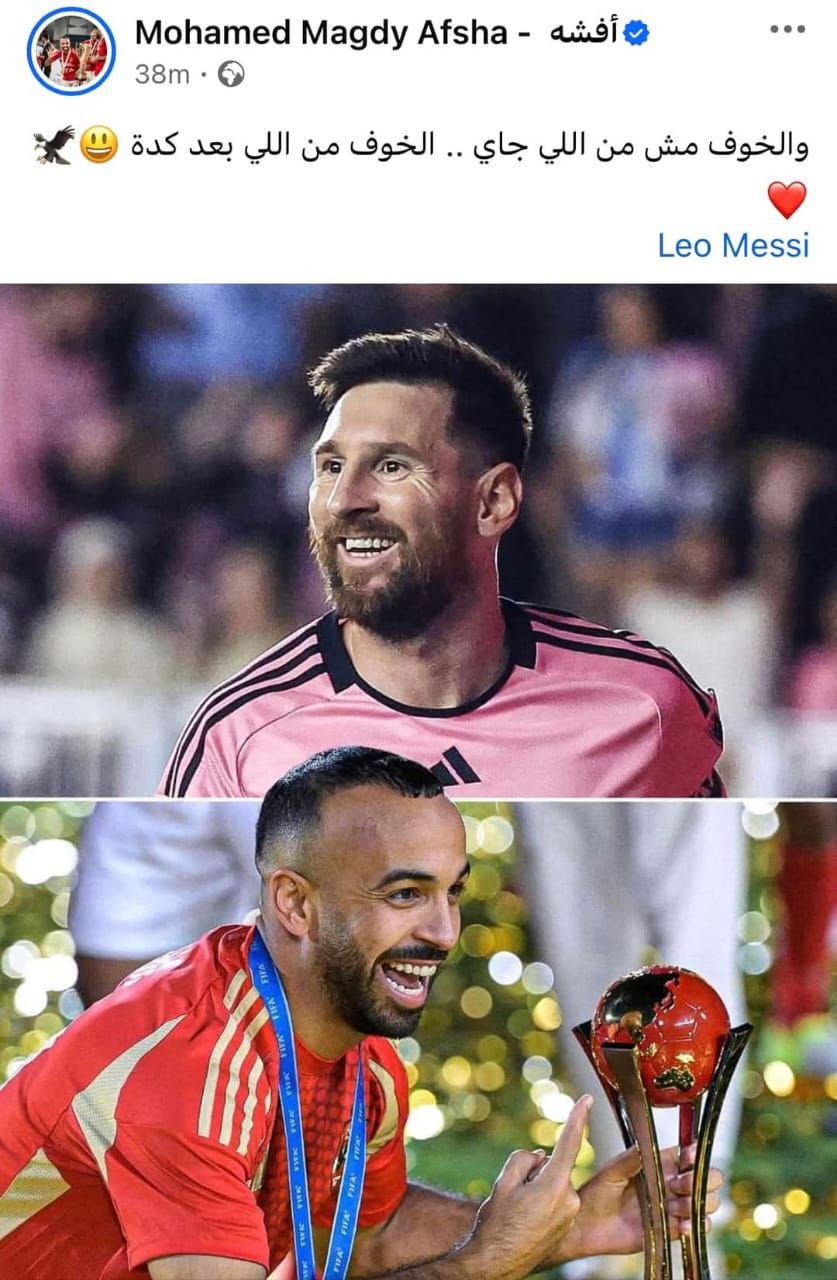 ونشر نجم النادي الأهلي صورة له رفقة ليونيل ميسي، أسطورة الأرجنتين وقائد فريق إنتر ميامي قبل مواجهة الفريقين في افتتاحية بطولة كاس العالم للاندية، وكتب عليها قائلًا: "الخوف مش من اللي جاي الخوف من اللي بعد كده".