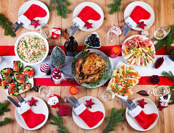 الحلويات: يجب تحضير بعض أصناف الحلويات التي تتناسب مع الاحتفالية، بألوان وأشكال مبهجة، وخاصة في حالة وجود أطفال، ونمها الكب كيك والكوكيز، و الجاتوه السوارية، والبسكوت الملون بألوان الكريسماس التقليدية.