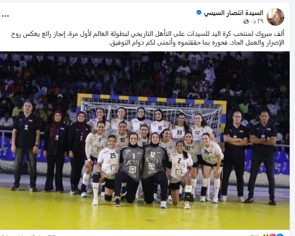 السيدة انتصار السيسى تهنئ منتخب كرة اليد للسيدات على التأهل لبطولة العالم