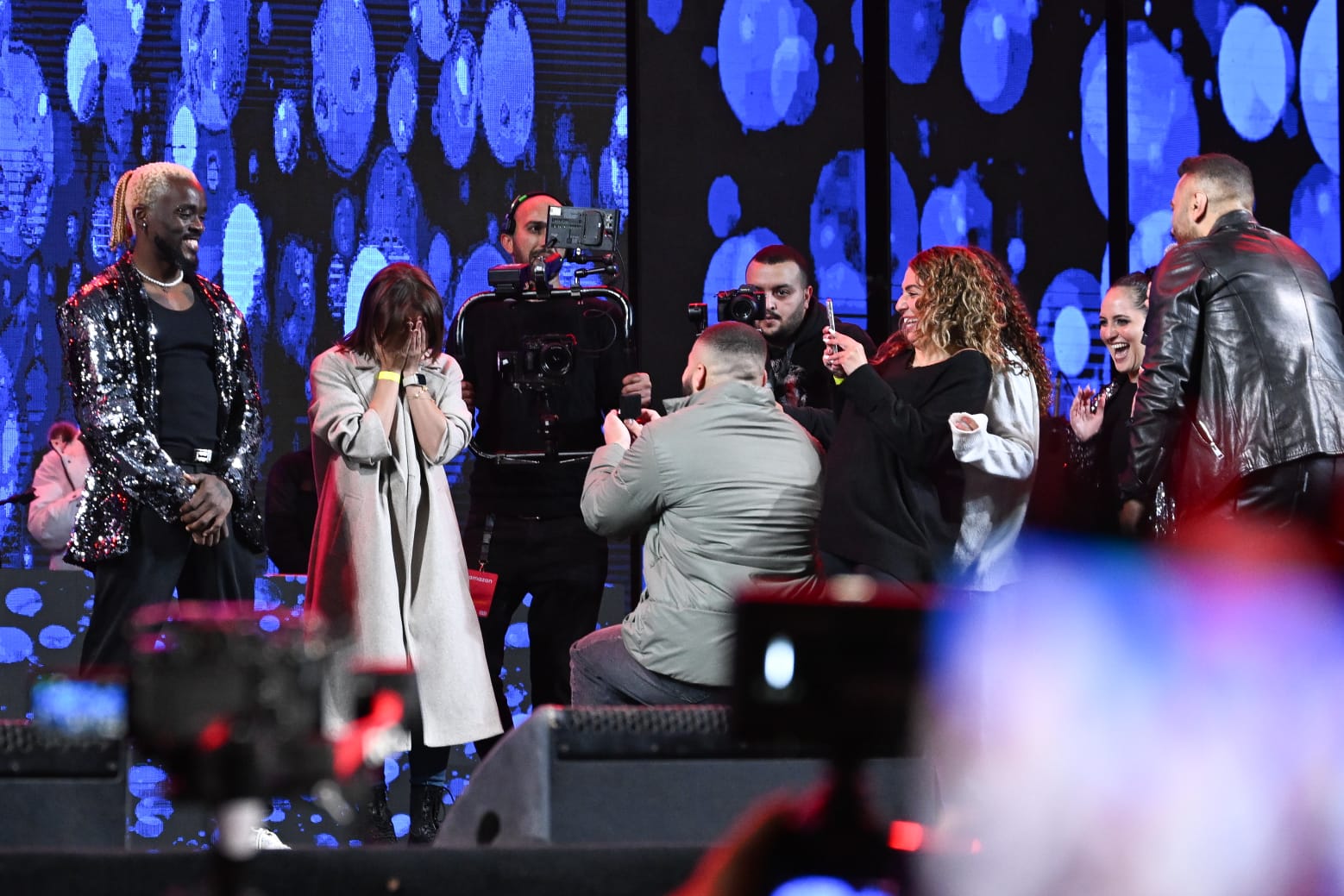 كما صعد شاب وخطيبته بجوار تامر حسني على خشبة المسرح وأعلن طلبه للزواج منها أمام الجمهور وسط المزيد من أجواء البهجة والإثارة وقاما العروسان بعدها بالتقاط صورة "سيلفي" مع نجمهم المفضل.