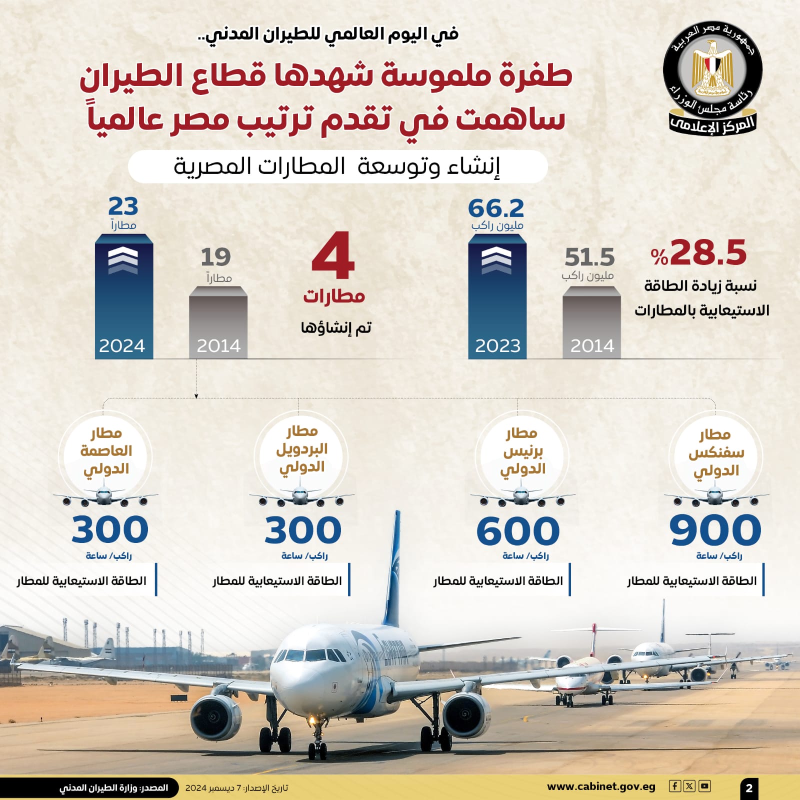 وفي هذا الصدد نشر المركز الإعلامي لمجلس الوزراء تقريرًا، بمناسبة اليوم العالمي للطيران المدني، تضمن إنفوجرافات تسلط الضوء على ما شهده قطاع الطيران من طفرة ملموسة ساهمت في تقدم ترتيب مصر عالمياً.