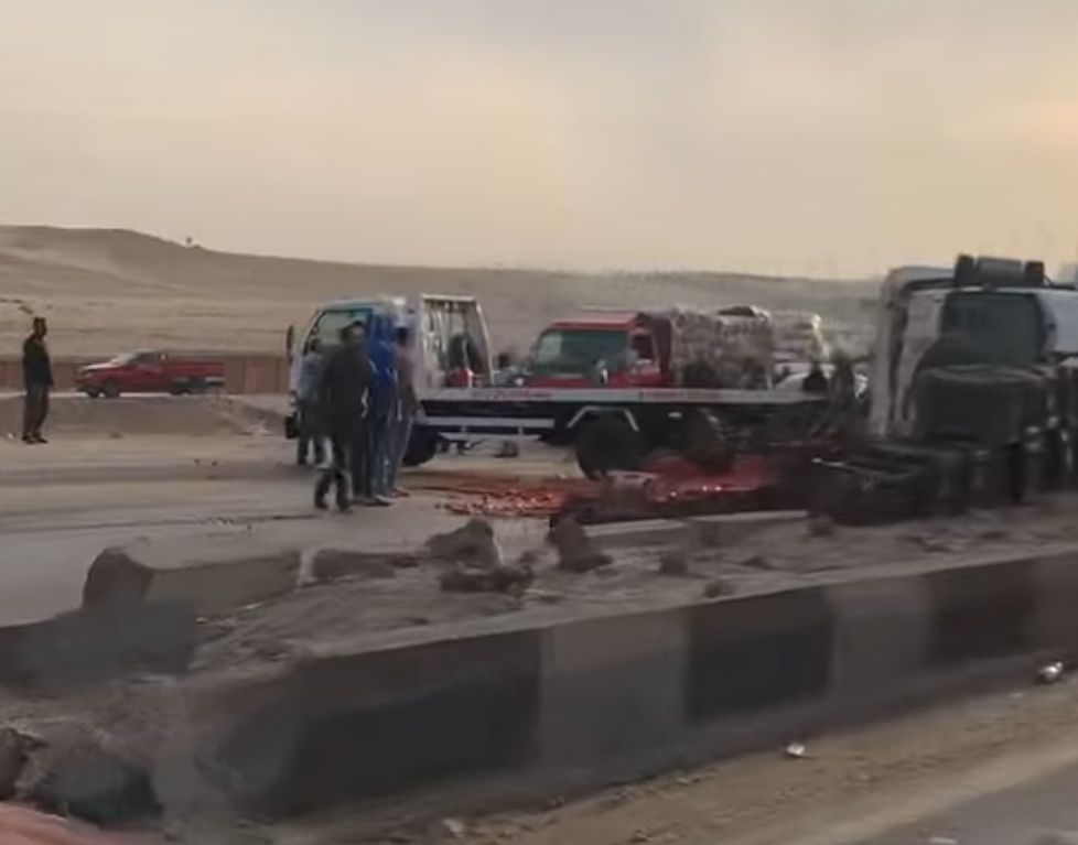 حادث انقلاب سيارة نقل محملة بالطماطم أعلى الطريق الدائري