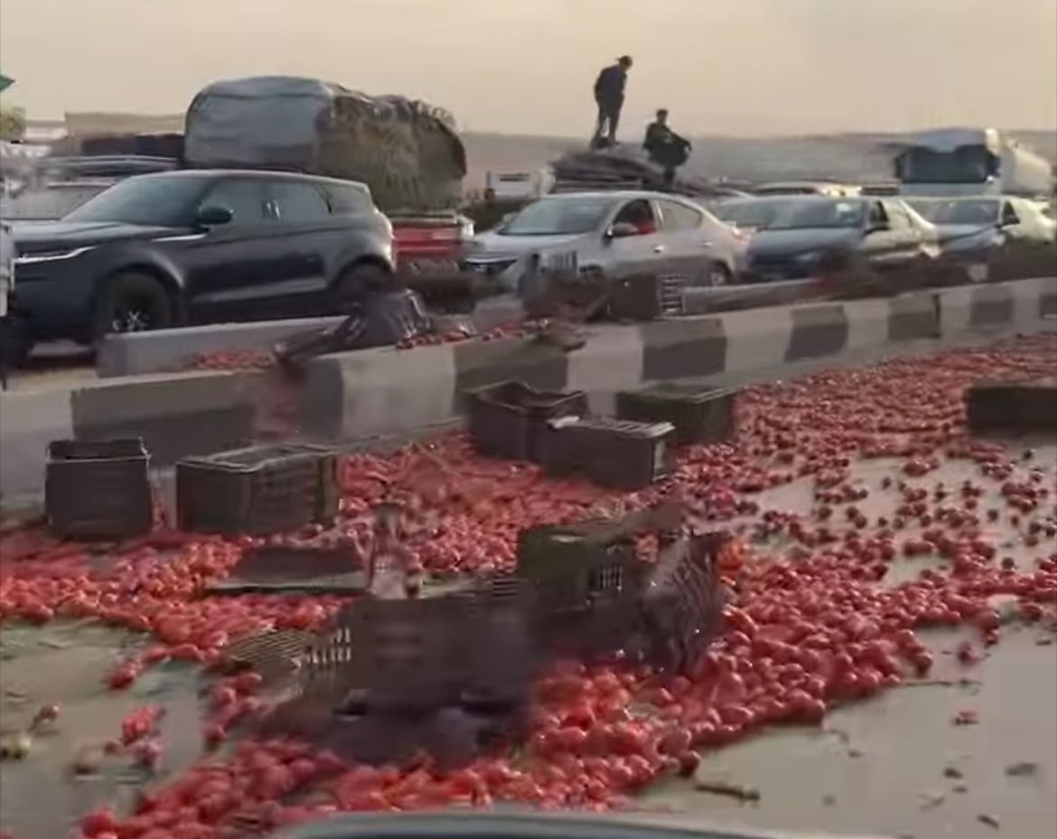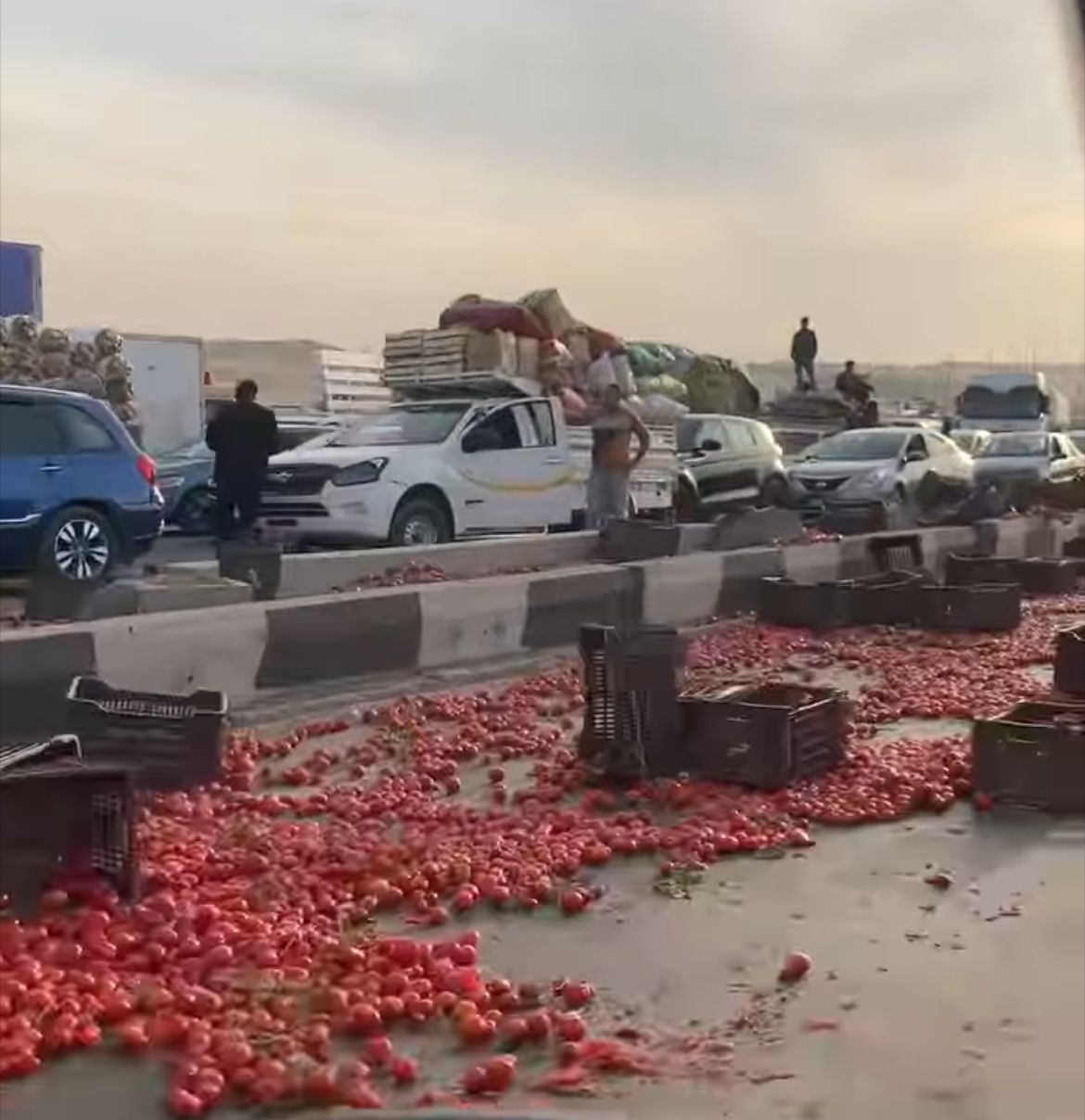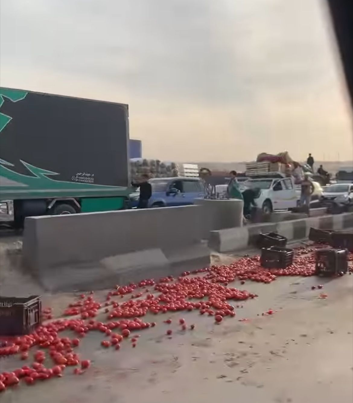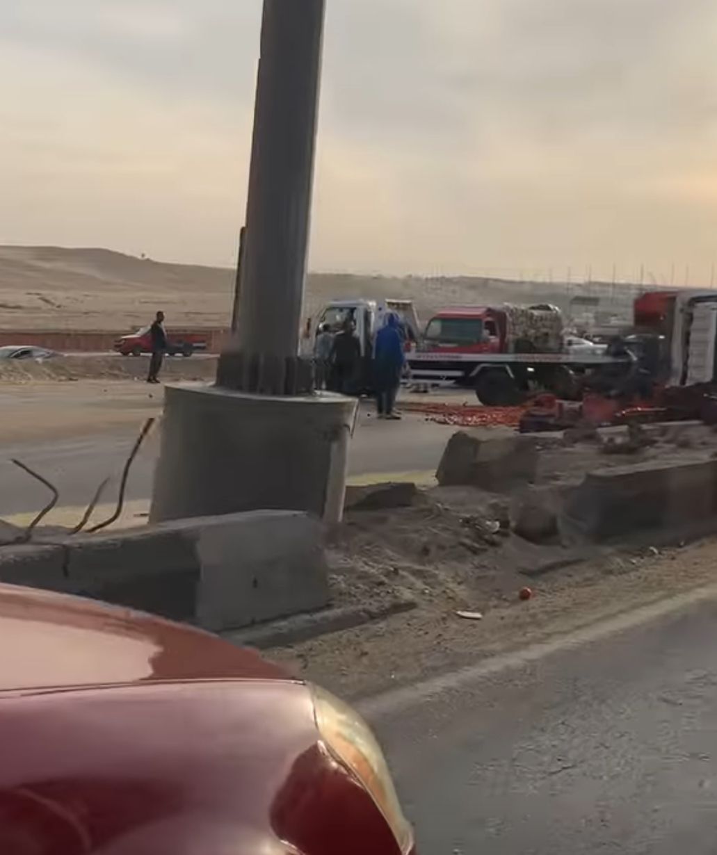 على الفور انتقلت الأجهزة الأمنية إلى مكان الحادث، وتبين من خلال الفحص انقلاب سيارة نقل محملة بالطماطم أعلى الطريق الدائري.