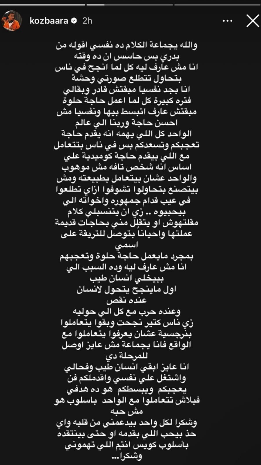 وتابع: "أحيانا الكلام عليا بيوصل للتريقة على اسمي بمجرد ما يعمل حاجة حلوة وتعجبهم أنا مش عارف ليه وده السبب اللي يخلي إنسان طيب أول ما ينجح يتحول لإنسان عنده نقص وعنده حرب مع كل اللي حواليه زي ناس كتير نجحت وبقوا يتعاملوا بنرجسية عشان يعرفوا يتعاملوا مع الواقع فأنا يا جماعة مش عايز أوصل للمرحلة دي أنا عايز أبقي إنسان طيب وفي حالي واشتغل على نفسي وأقدم لكم فن يعجبكم ويبسطكم هو ده هدفي فبلاش تتعاملوا مع الواحد بأسلوب هو مش حبه وشكرا لكل واحد بيدعمني من قلبه واي حد بيحب اللي بقدمه أو حتى بينتقده بأسلوب كويس أنتم اللي تهموني".