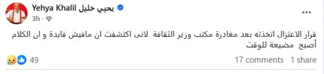 كتب يحيي خليل منشورا على صفحته الرسمية عبر موقع التواصل الاجتماعي "فيسبوك" وعلق قائلا : "قرار الاعتزال اتخذته بعد مغادرة مكتب وزير الثقافة لأني اكتشفت إن مفيش فايدة وإن الكلام أصبح مضيعة للوقت" .