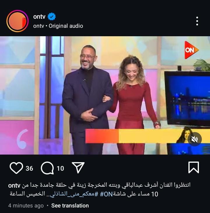 ونشرت قناة أون عبر حسابها الرسمي علي موقع تبادل الصور والفديوهات القصيرة “ إنستجرام” برومو البرنامج في هذه الحلقة معلقا: “ انتظرو الفنان أشرف عبد الباقي وبنتة المخرجة زينة في حلقة جامدة جدا في برنامج معكم مني الشاذلي يوم الخميس الساعة 10 مساء علي قناة ON”.