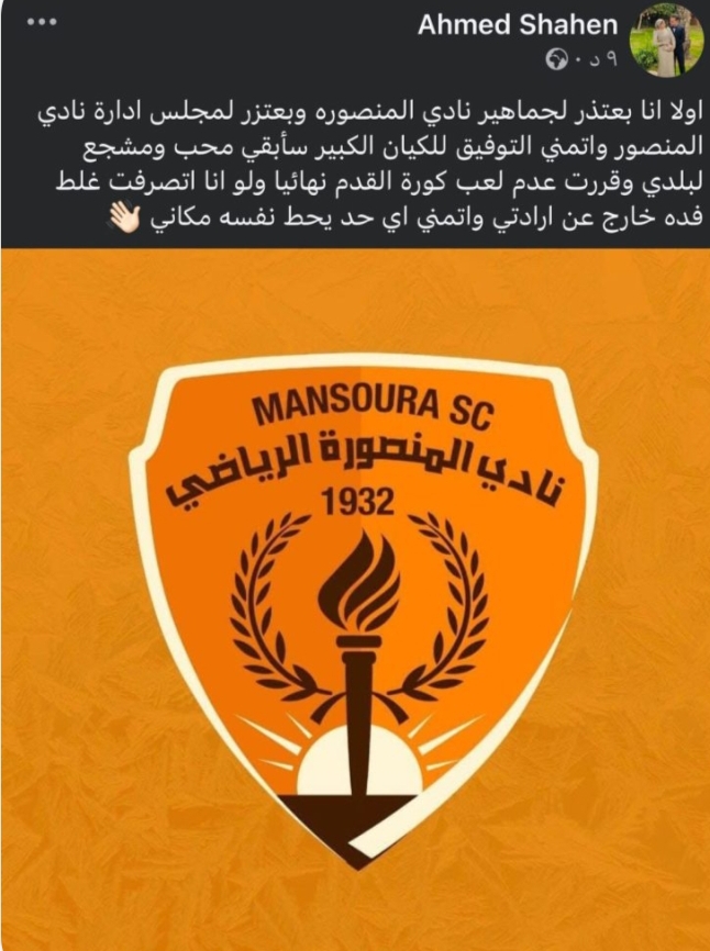 حيث قال لاعب المنصورة عبر حسابه الشخصي على موقع التواصل الاجتماعي فيسبوك: “أولا أنا بعتذر لجماهير نادي المنصورة وبعتذر لمجلس إدارة نادي المنصورة، وأتمني التوفيق للكيان الكبير”.