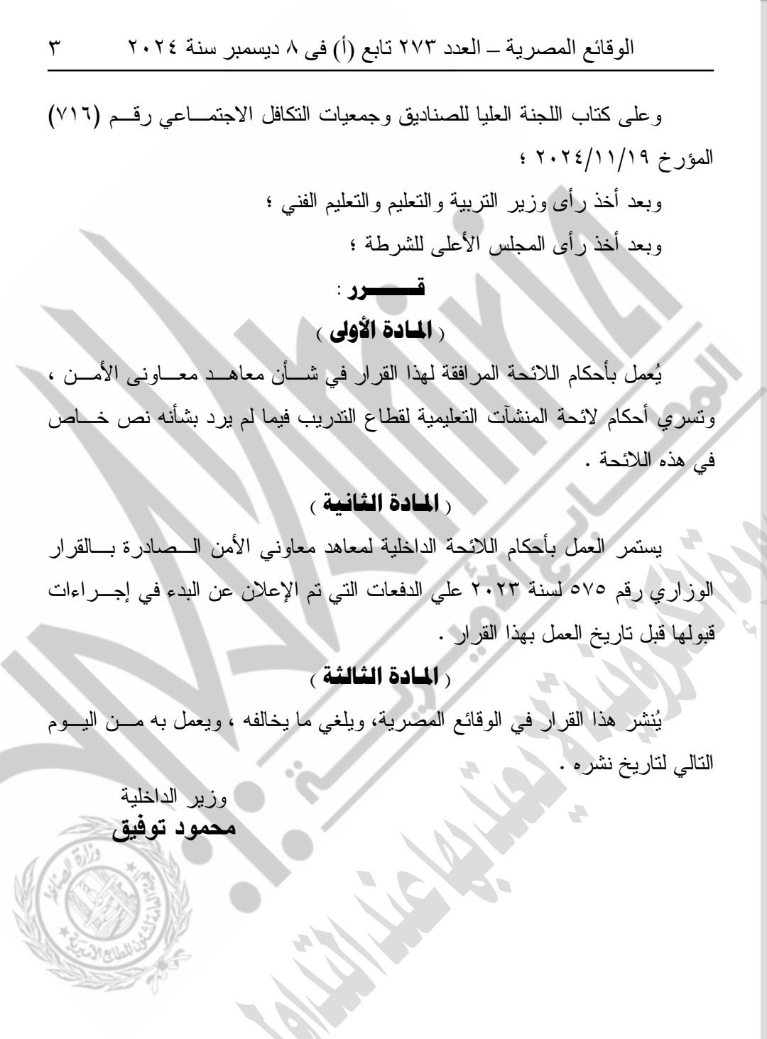 وننشر من خلال المستندات التالية، نص قرار وزير الداخلية بشأن معاهد معاوني الأمن على النحو التالي: