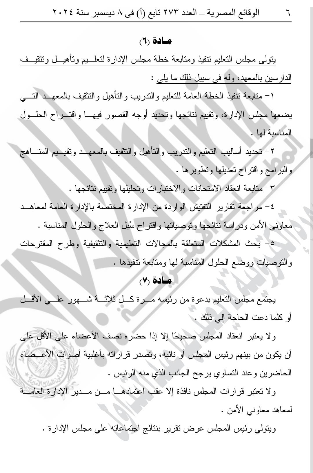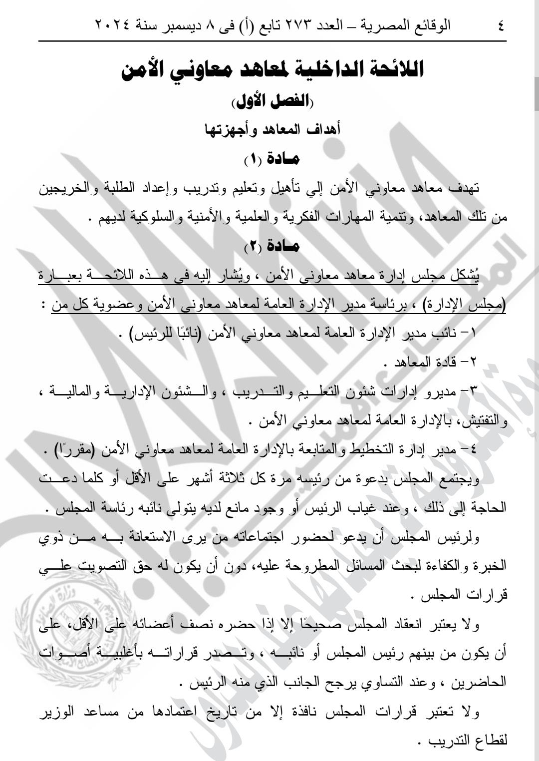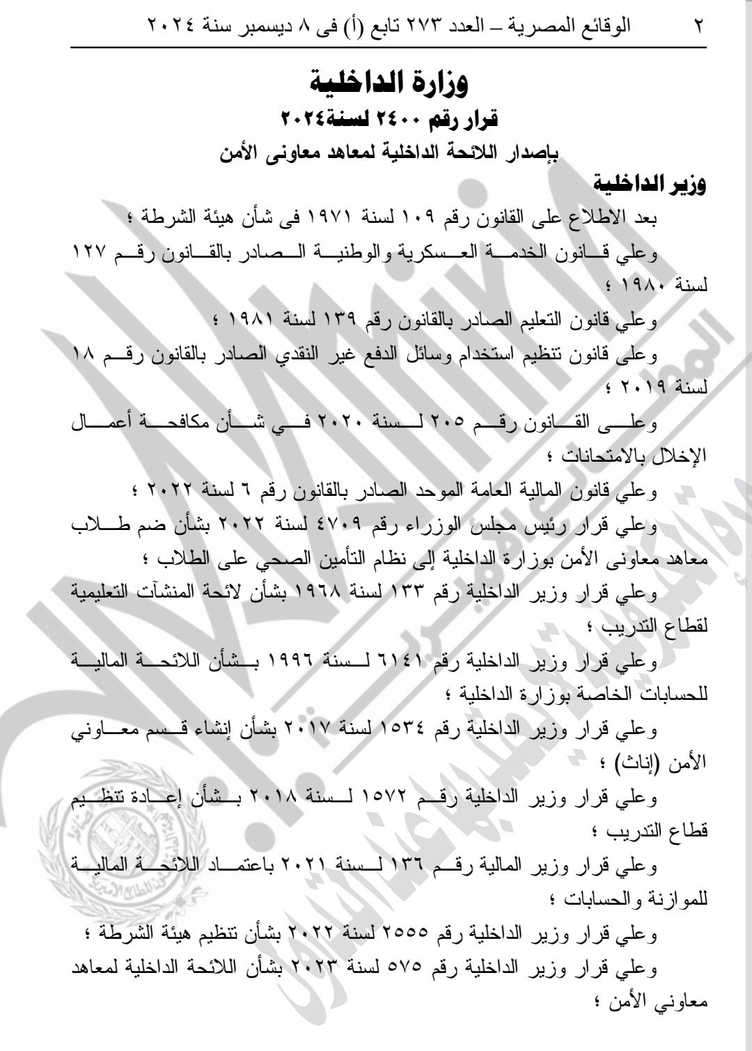 ونشرت الجريدة القرار رقم 2400 لسنة 2024 بإصدار اللائحة الداخلية لمعاهد معاوني الأمن، بعد الاطلاع على القانون رقم 109 لسنة 1971 في شأن هيئة الشرطة؛ وعلي قانون الخدمة العسكرية والوطنية الصادر بالقانون رقم 127 لسنة 1980؛ وعلي قانون التعليم الصادر بالقانون رقم ١٣٩ لسنة 1981؛ وعلى قانون تنظيم استخدام وسائل الدفع غير النقدي الصادر بالقانون رقم 18 لسنة 2019، وعلى قرار وزير الداخلية رقم 2555 لسنة 2022 بشأن تنظيم هيئة الشرطة ؛ وعلى قرار وزير الداخلية رقم 575 لسنة 2023 بشأن اللائحة الداخلية لمعاهد معاوني الأمن؛ وبعد أخذ رأى وزير التربية والتعليم والتعليم الفنى، وبعد أخذ رأى المجلس الأعلى للشرطة.
