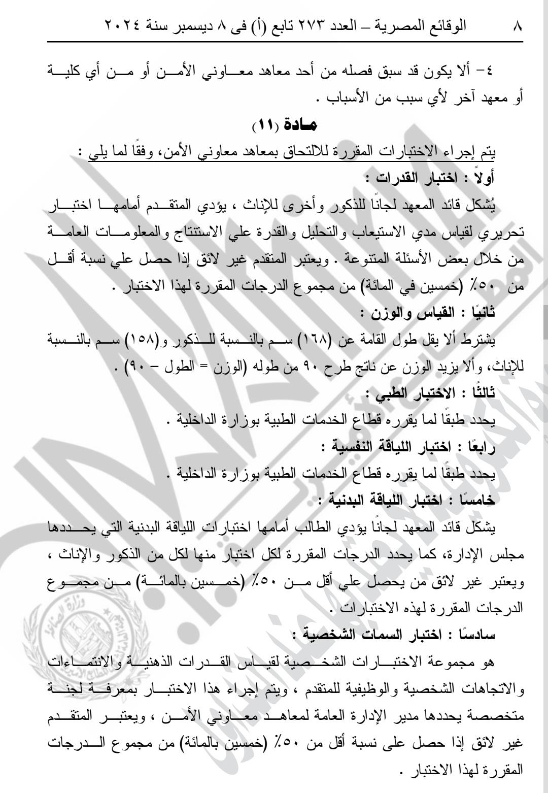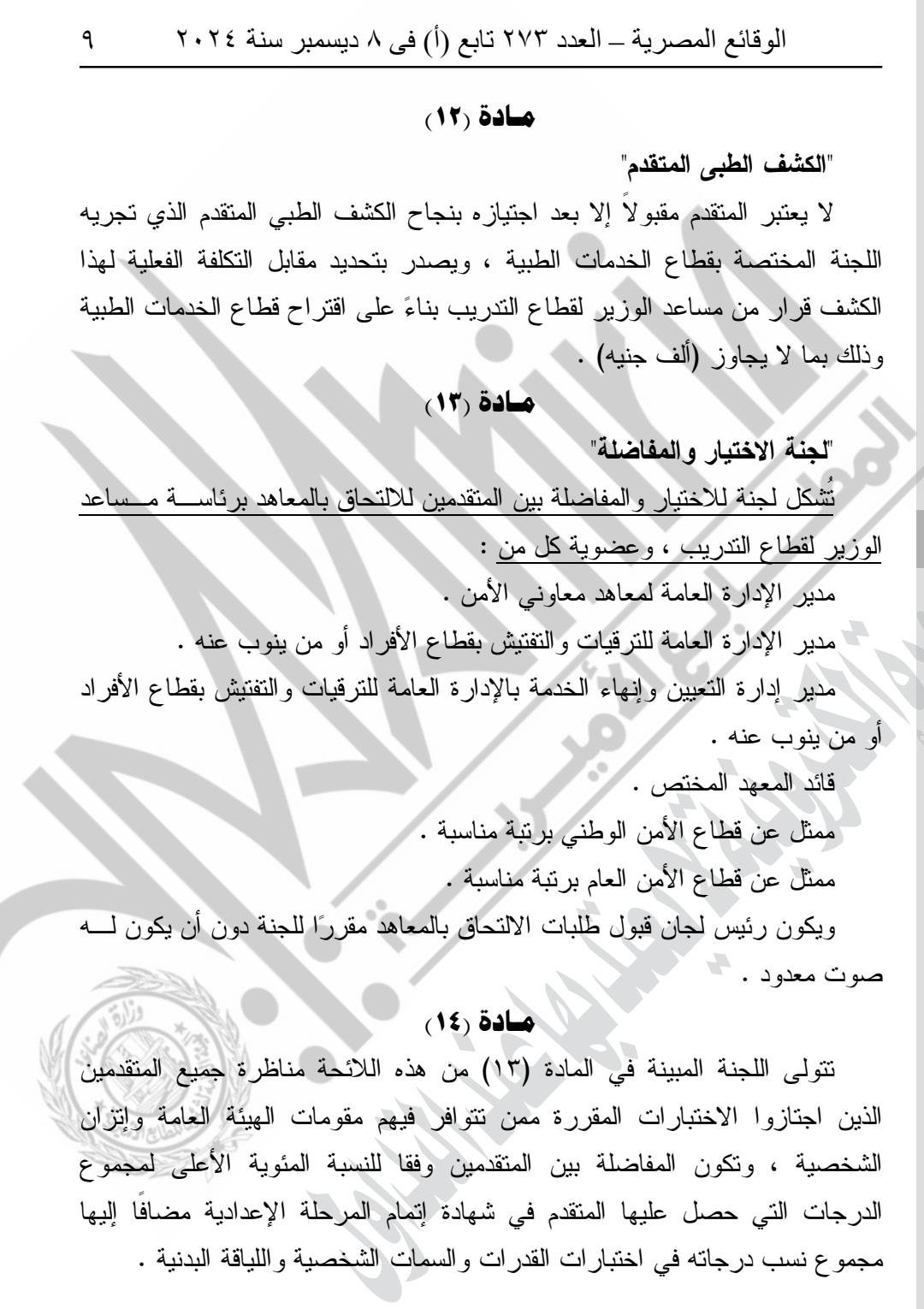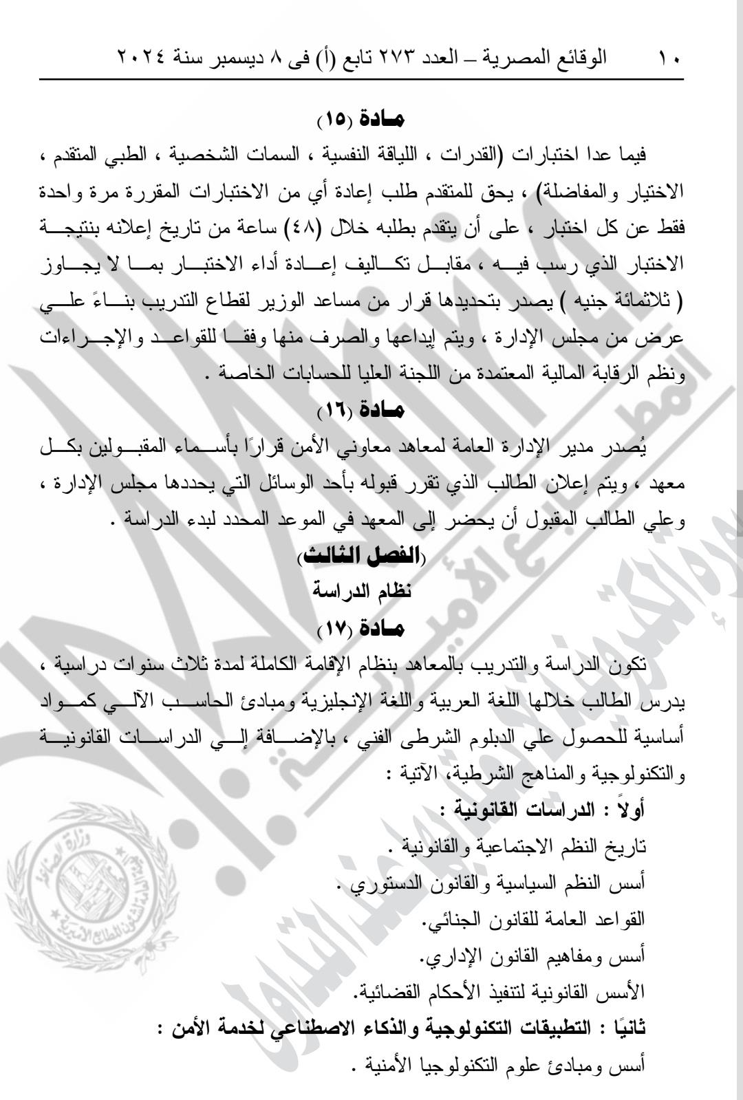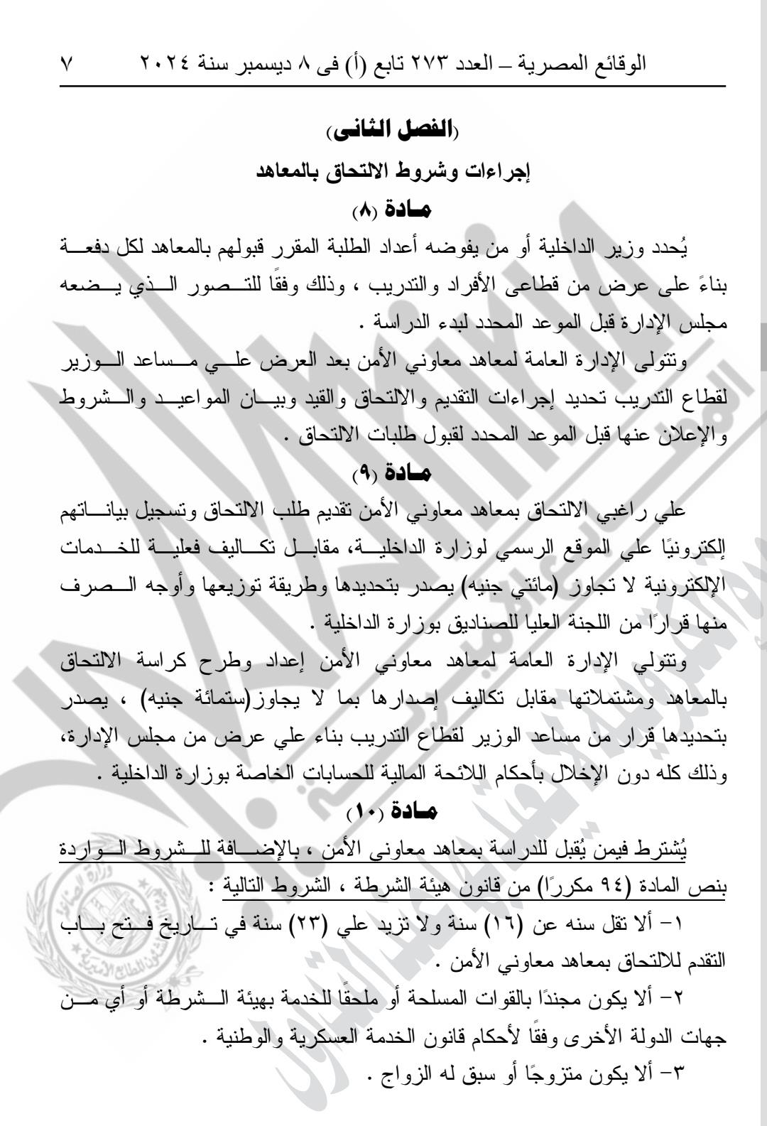 ونشرت الجريدة القرار رقم 2400 لسنة 2024 بإصدار اللائحة الداخلية لمعاهد معاوني الأمن، بعد الاطلاع على القانون رقم 109 لسنة 1971 في شأن هيئة الشرطة؛ وعلي قانون الخدمة العسكرية والوطنية الصادر بالقانون رقم 127 لسنة 1980؛ وعلي قانون التعليم الصادر بالقانون رقم ١٣٩ لسنة 1981؛ وعلى قانون تنظيم استخدام وسائل الدفع غير النقدي الصادر بالقانون رقم 18 لسنة 2019، وعلى قرار وزير الداخلية رقم 2555 لسنة 2022 بشأن تنظيم هيئة الشرطة ؛ وعلى قرار وزير الداخلية رقم 575 لسنة 2023 بشأن اللائحة الداخلية لمعاهد معاوني الأمن؛ وبعد أخذ رأى وزير التربية والتعليم والتعليم الفنى، وبعد أخذ رأى المجلس الأعلى للشرطة.