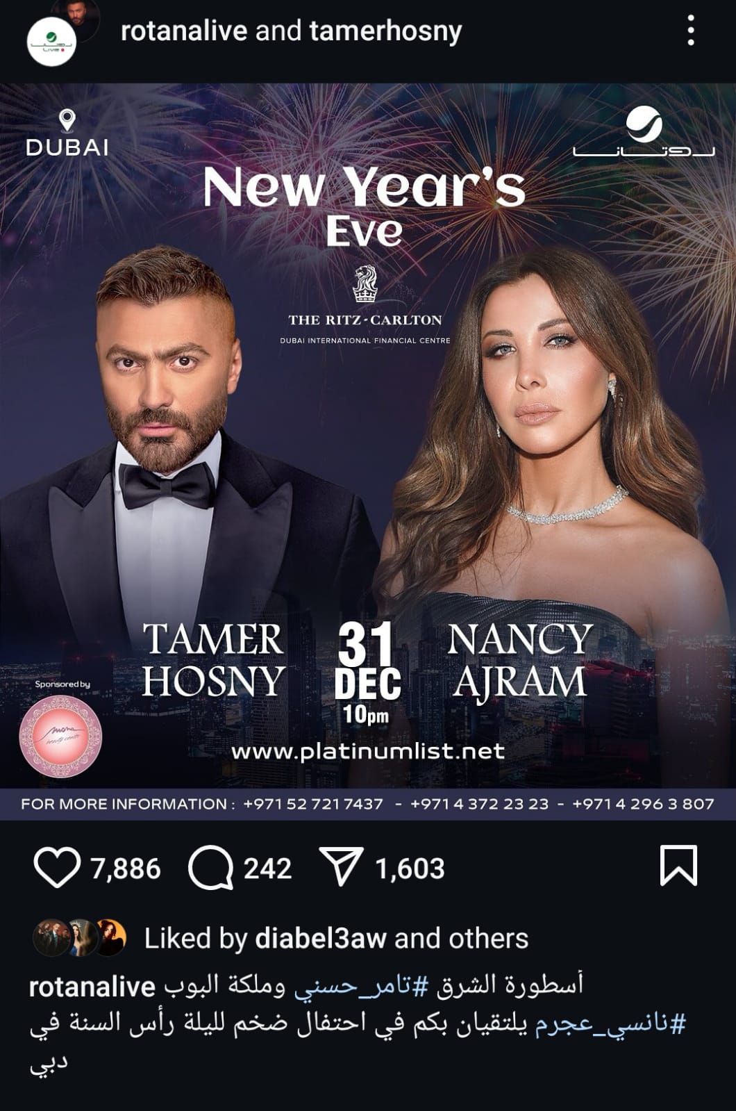 نشرت روتانا لايف بوستر الحفل على الصفحة الرسمية عبر موقع تبادل الصور والفيديوهات "إنستجرام" وعلقت قائلة : "أسطورة الشرق تامر حسني وملكة البوب نانسي عجرم يلتقيان بكم في احتفال ضخم ليلة رأس السنة في دبي" .