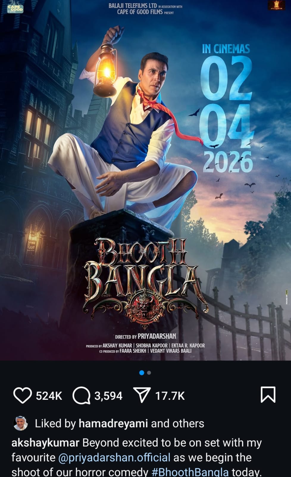 أعلن النجم الهندي أكشاي كومار منذ قليل عن انطلاق تصوير فيلمه الجديد Bhooth Bangla استعدادا لطرحه بدور العرض الهندية في 2 أبريل عام 2026 .