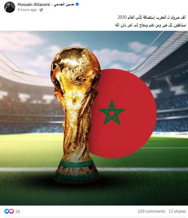 وكتب حسن الجسمي عبر صفحته الرسمية "فيس بوك" " الف مبروك لـ المغرب إستضافة كأس العالم 2030 ،تستاهلون كل خير ومن تقدم ونجاح إلى آخر بإذن الله".
