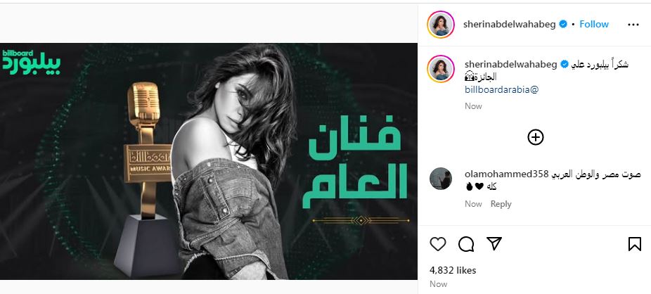 وعلقت شيرين علي هذه الجائزة عبر صفحتها الرسمية "إنستجرام" وكتبت "شكرا بيلبورد على الجائزة".