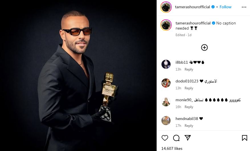 أول تعلق من تامر عاشور بعد فوزه بجائزتين بيلبورد عربية (صورة)
