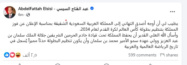 حيث نشر الرئيس السيسي عبر حسابة الشخصي على موقع التواصل الاجتماعى الفيس بوك رسالة تهنئة قال فيها" يطيب لي أن أوجه أصدق التهاني إلى المملكة العربية السعودية الشقيقة بمناسبة الإعلان عن فوز المملكة بتنظيم بطولة كأس العالم لكرة القدم لعام 2034.