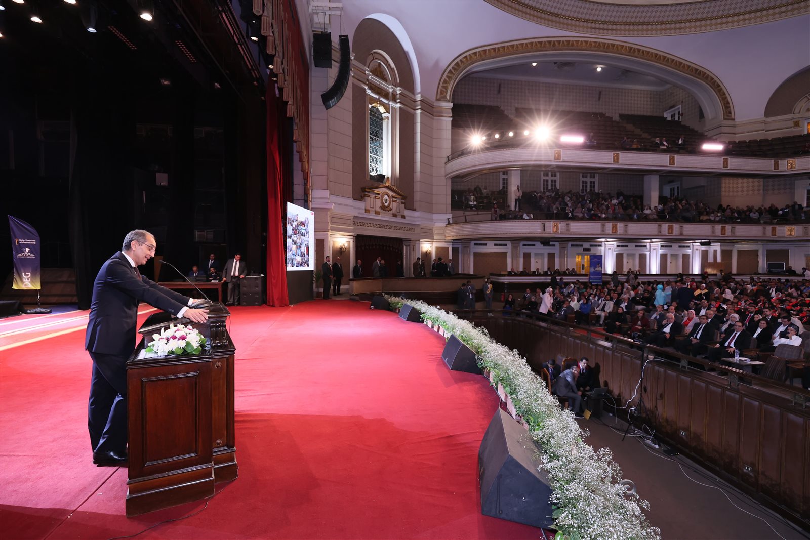 حضر فعاليات حفل التخرج الدكتور/ أحمد خطاب مدير المعهد القومى للاتصالات، والمهندسة / هدى دحروج مستشار وزير الاتصالات وتكنولوجيا المعلومات للتنمية المجتمعية الرقمية، والمهندس/ محمود بدوى مستشار وزير الاتصالات وتكنولوجيا المعلومات لشئون التحول الرقمى.