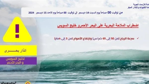 حذرت الهيئة العامة للأرصاد الجوية، من اضطراب الملاحة البحرية على البحر الأحمر وخليج السويس، اليوم السبت 14 ديسمبر 2024.