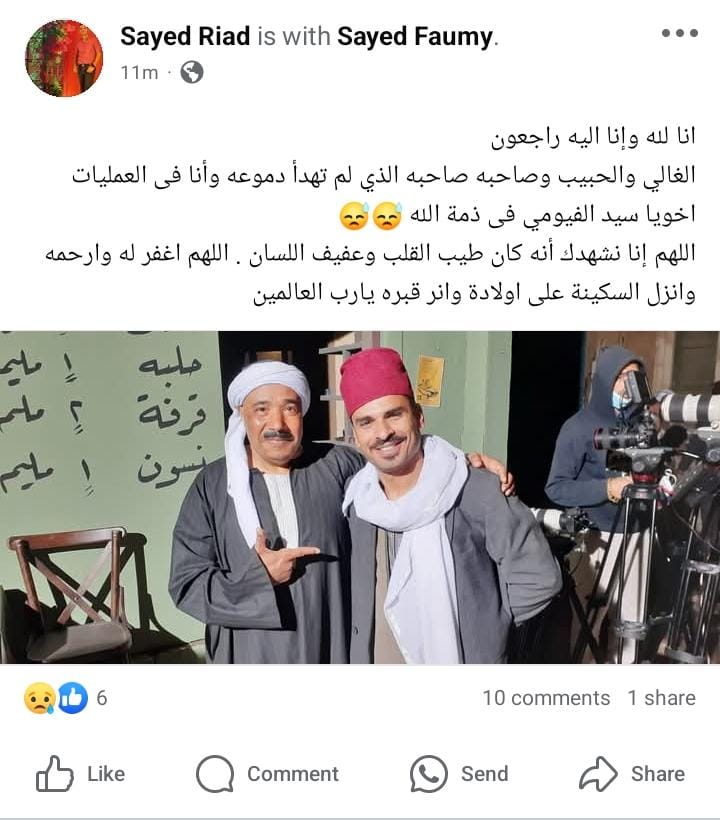 رحل الفنان سيد محمود الفيومي عن عالمنا اليوم السبت الموافق 14 ديسمبر، وأعلن عن خبر الوفاة سيد رياض عبر حسابة الرسمي علي موقع التواصل الإجتماعي “ فيسبوك” معلقا: “ إنا لله وإنا إلية راجعون، الغالي والحبيب وصاحب صاحبة الذي لم تهدأ دموعة وأنا في العمليات، اخويا سيد الفيومي في ذمة اللة”.
