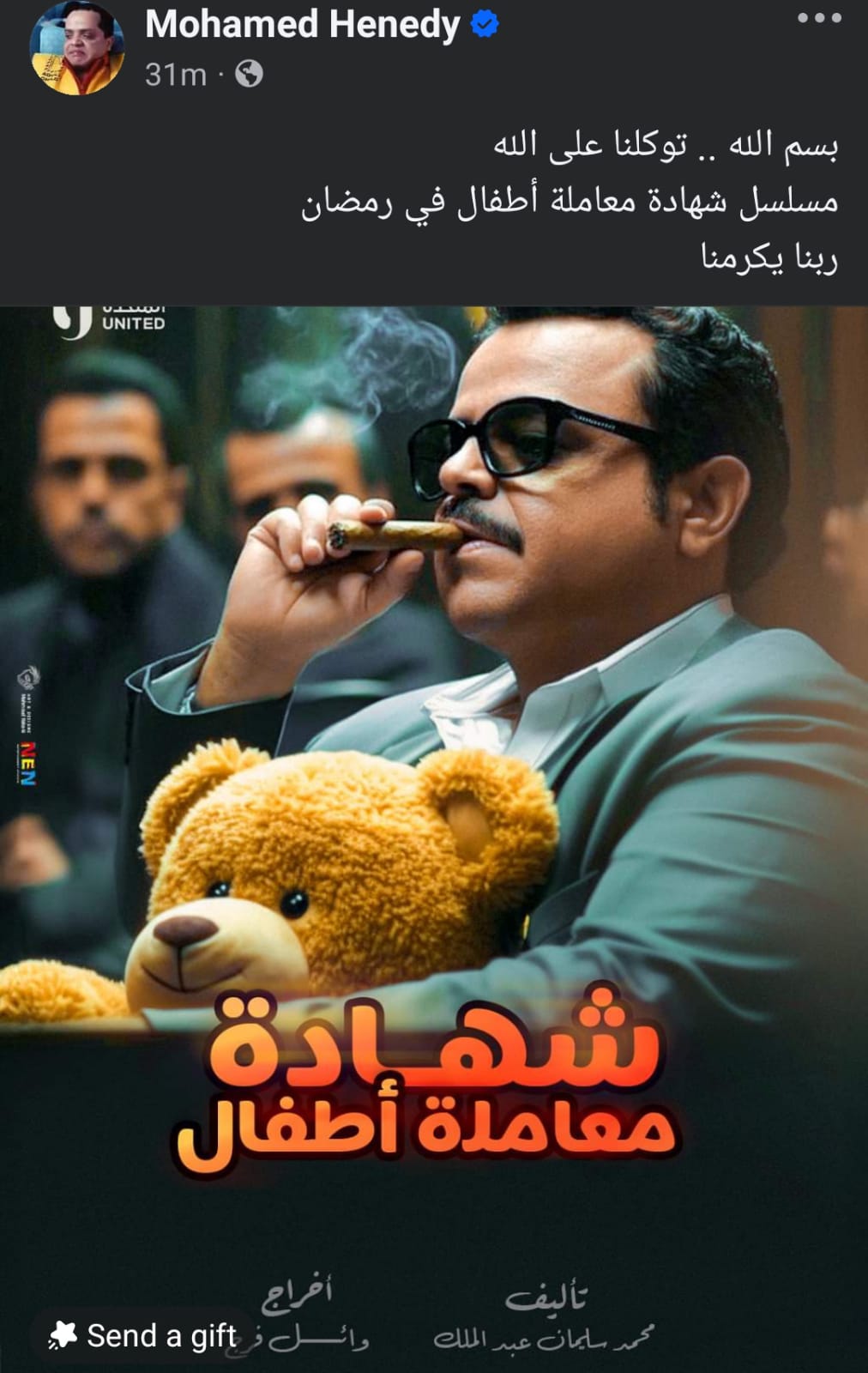 يشارك الفنان محمد هنيدي في موسم دراما رمضان 2025 بمسلسل جديد يحمل اسم شهادة معاملة أطفال، وذلك بعد غياب دام 6 سنوات منذ أخر أعماله السينمائية أرض النفاق، وانضمت الفنانة نهي عابدين لـ أبطال المسلسل، ومن المقرر أن يبدأ التصوير في الأيام المقبلة.