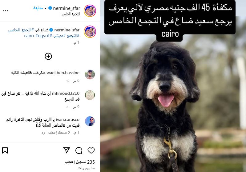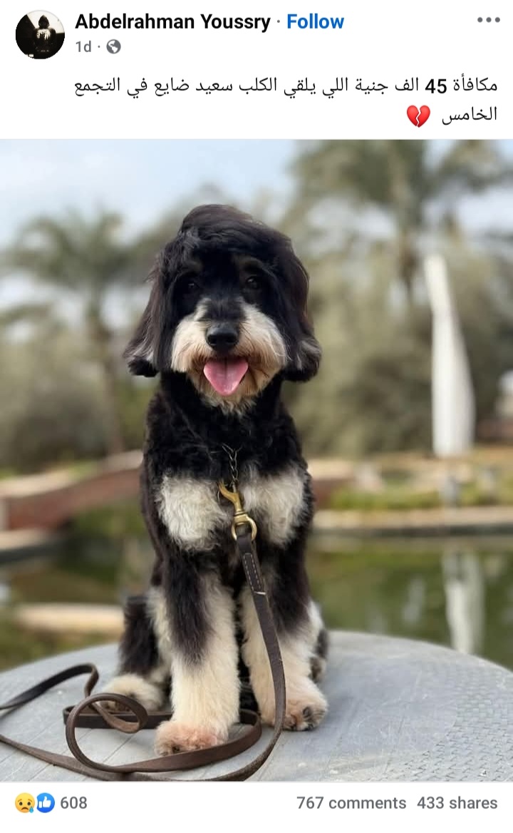ونشرت صاحبة الكلب منشور قائلة " سعيد ابني ضاع في التجمع الخامس اللي يلاقيه عنده مكافأة 45 ألف جنية مصري".