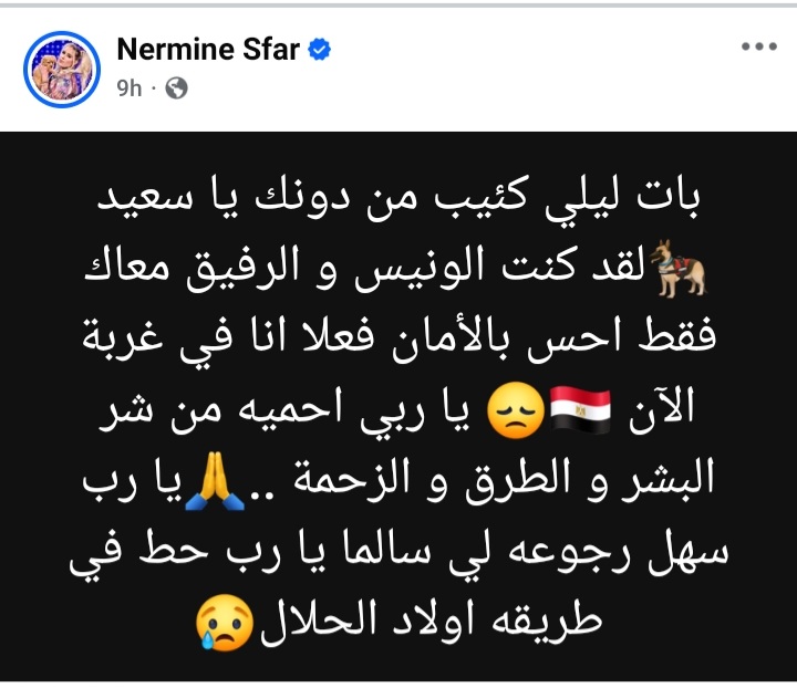 واستعطفت الفنانة الاستعراضية نرمين سفر متابعيها بالبحث عن الكلب ووجهة رسالة مؤثرة قالت فيها :"بات ليلي كئيب من دونك يا سعيد الآن لقد كنت الونيس والرفيق معاك فقط احس بالأمان فعلا انا في غربة يا ربي احميه من شر البشر والطرق و الزحمة .. يا رب سهل رجوعه لي سالما يا رب حط في طريقه اولاد الحلال".