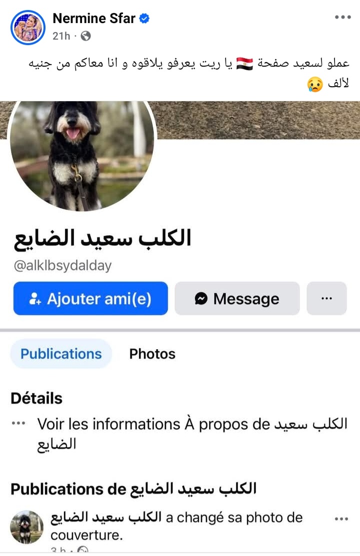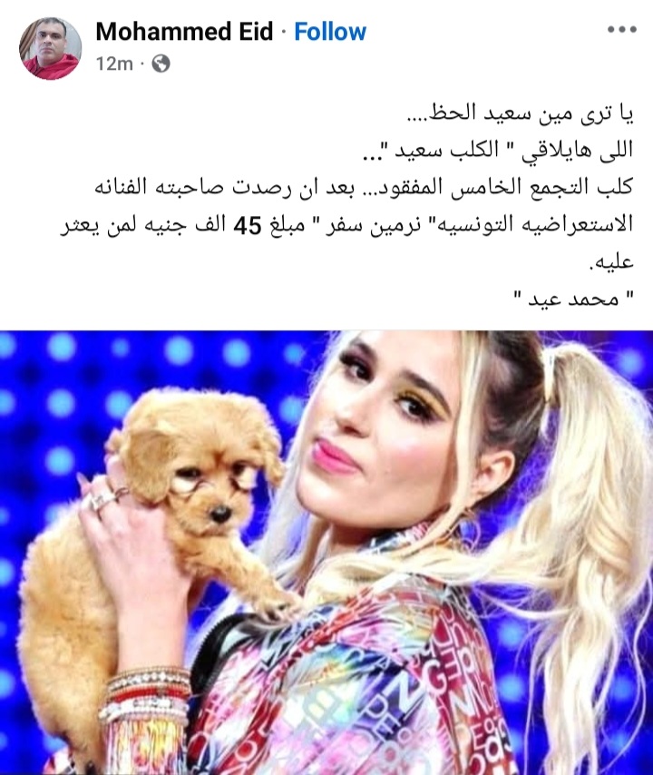 وأعلنت صاحبة الكلب وهي الفنانة الاستعراضية التونسية نرمين سفر على مكافأة مالية قدرها 45 ألف جنيه لمن يجده .