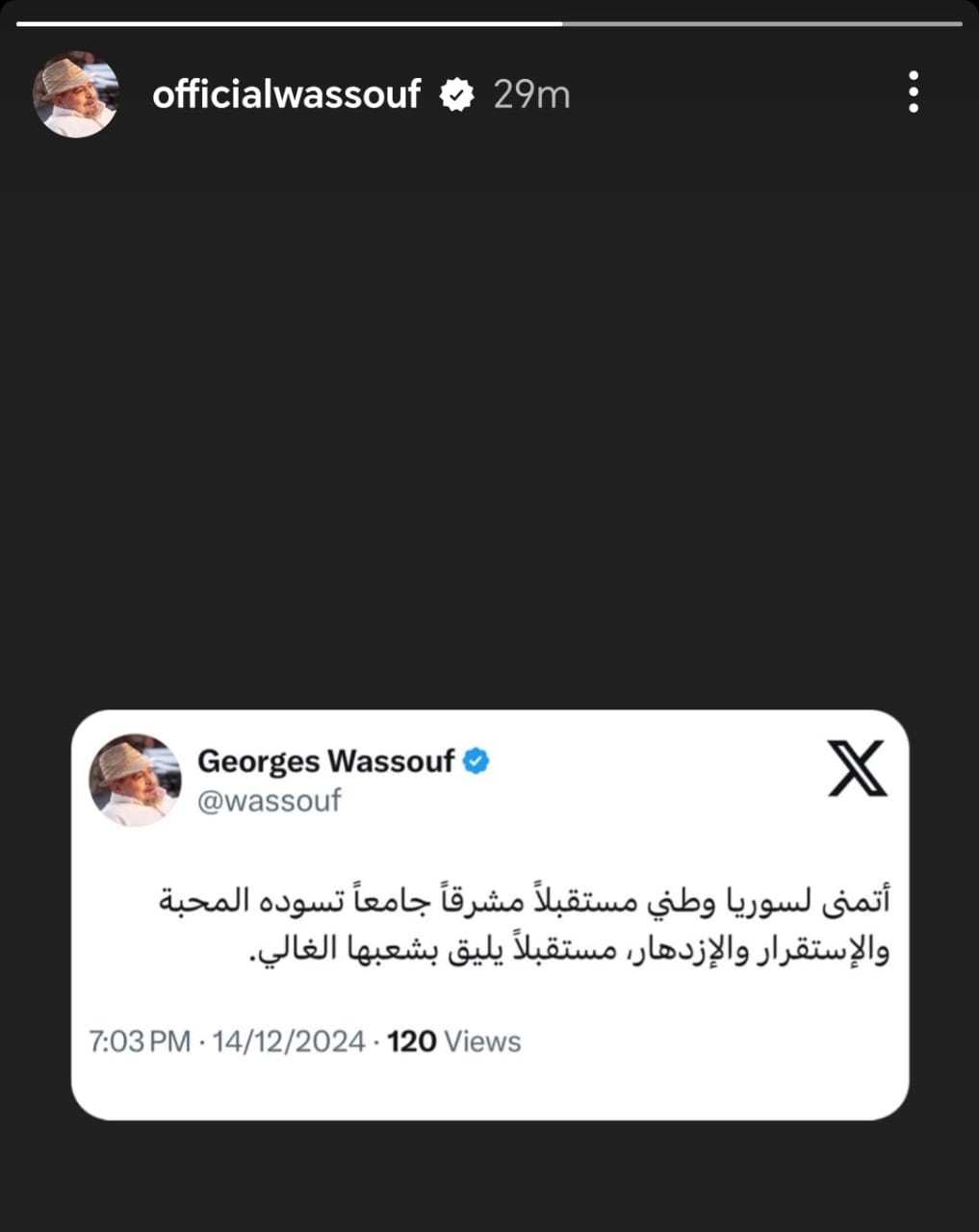 نشر جورج وسوف ستوري على صفحته الرسمية عبر موقع تبادل الصور والفيديوهات "إنستجرام" وعلق قائلا : "أتمنى لسوريا وطني مستقبلا مشرقا جامعا تيوده المحبة والاستقرار والازدهار، مستقبلا يليق بشعبها الغالي" .