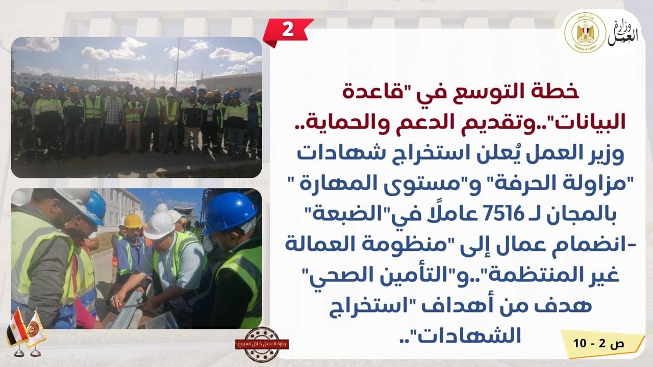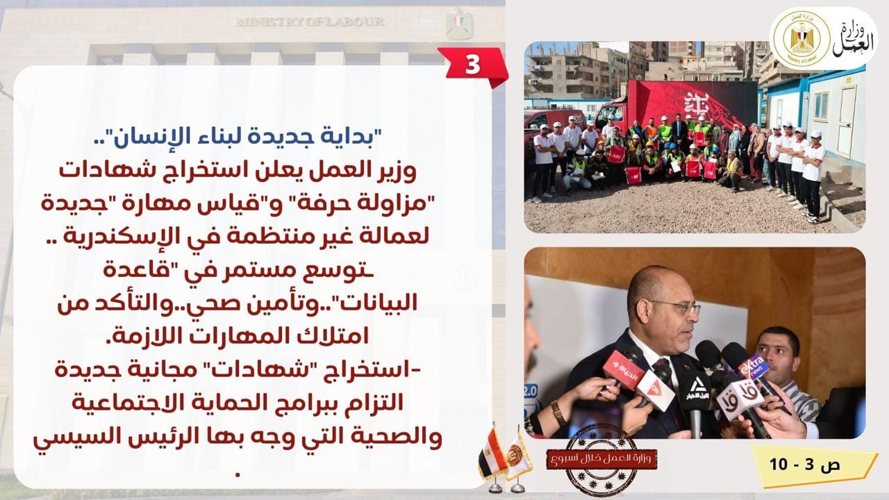 وقال الوزير، إن الانتهاء من استخراج 700 شهادة جديدة لعمال الإسكندرية، يأتي في إطار جهود التوسع في قاعدة بيانات العمالة غير المنتظمة، وتقديم الدعم والرعاية لهم، والتأمين الصحي عليهم.