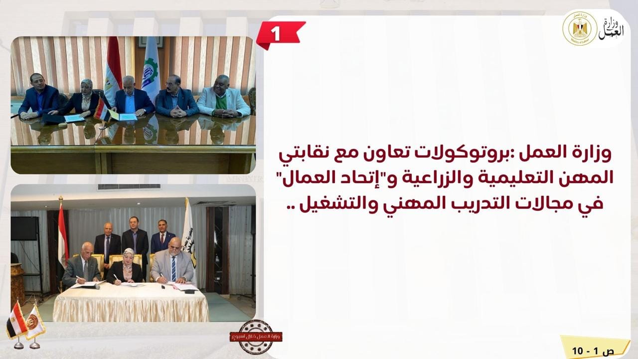 أصدرت وزارة العمل، اليوم السبت، إنفوجراف لرصد نشاط الوزارة في 7 أيام، حيث أنه خلال هذا الأسبوع، وبتوجيه من وزير العمل محمد جبران، جرى توقيع بروتوكولات تعاون مع نقابتي المهن التعليمية والزراعية واتحاد العمال في مجالات التدريب المهني والتشغيل، وتأهيل الخريجين والشباب والعاملين المرشحين من تلك الأطراف الموقعة بالمجان، على احتياجات سوق العمل، ورفع الوعي النقابي، والاستفادة من منظومة وزارة العمل.