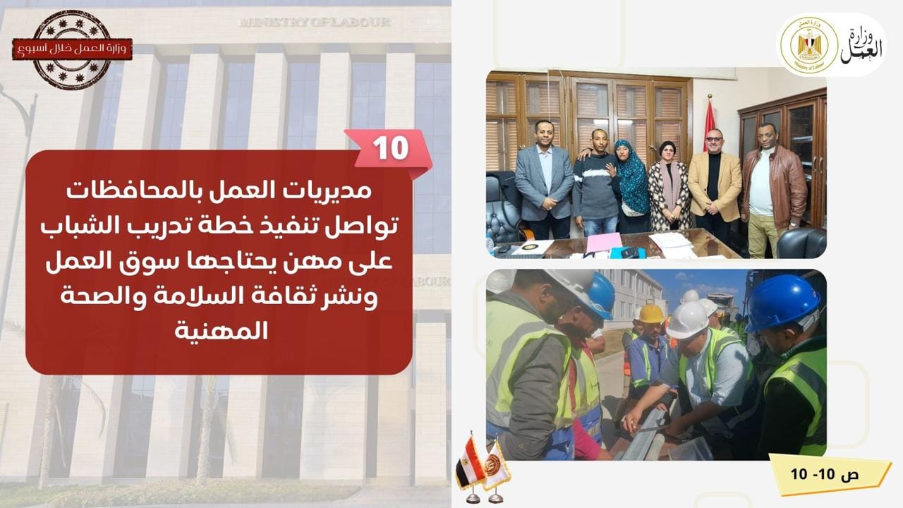 وتواصل مديريات العمل في كافة المحافظات جهودها في المشاركة في تنفيذ أهداف المبادرة الرئاسية بداية جديدة لبناء الإنسان، من خلال نشر ثقافة السلامة والصحة المهنية في مواقع العمل والإنتاج، وتنفيذ استراتيجية التدريب من أجل التشغيل.
