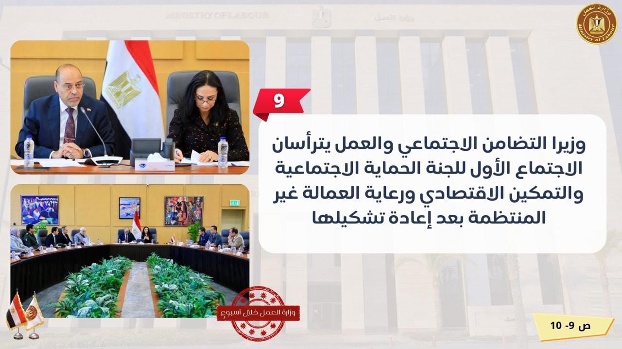 ومن اللقاءات الهامة هذا الأسبوع، ترأست الدكتورة مايا مرسي وزيرة التضامن الاجتماعي، ومحمد جبران وزير العمل، الاجتماع الأول للجنة الحماية الاجتماعية والتمكين الاقتصادي ورعاية العمالة غير المنتظمة، والتي صدر قرار من الوزيرين بإعادة تشكيلها، حيث عقد الاجتماع بحضور اللواء جمال عوض رئيس مجلس إدارة الهيئة القومية للتأمين الاجتماعي وأعضاء اللجنة ممثلي مختلف الوزارات والهيئات.