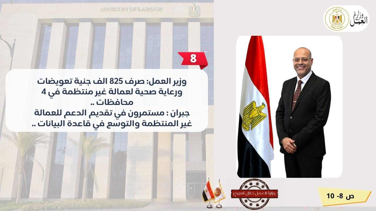 وفي نفس سياق دعم العمالة غير المنتظمة، أعلن وزير العمل عن الموافقة على صرف مبلغ 825 الف جنية تعويضات لأسر 4 من العمالة غير منتظمة تعرضوا للوفاة أثناء العمل،في 3 محافظات هي، الغربية، وبني سويف، والجيزة، وذلك بواقع 200 ألف جنيه لكل متوفي، من بند المنحة المستحدثة في الحساب المركزي للعمالة غير المنتظمة بالوزارة.
