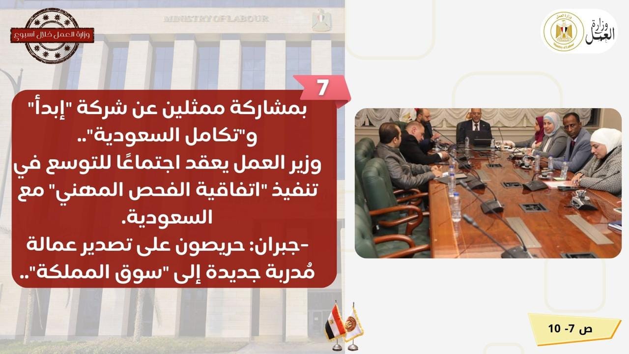 وعقد وزير العمل محمد جبران، اجتماعًا، بمقر الوزارة، مع الإدارات المختصة بالتدريب المهني، والمعلومات، بحضور ممثلين عن شركة "ابدأ" لتنمية المشروعات "الذراع التنفيذي للمبادرة الوطنية لتطوير الصناعة المصرية"، والتواصل خلال الاجتماع عن طريق الفيديو كونفرانس، مع قيادات شركة تكامل السعودية التي تمثل وزارة الموارد البشرية والتنمية الاجتماعية في المملكة، وذلك للتباحث بشأن المتابعة والتوسع في تنفيذ اتفاقية الفحص المهني مع السعودية، وإزالة كافة العقبات أمام عملية التنفيذ لهذه الاتفاقية التي تهدف إلى التحقق من امتلاك العامل المصري للمؤهلات والمهارات المطلوبة للعمل في السعودية، وضخ وتصدير عمالة مصرية ماهرة جديدة في سوق المملكة.