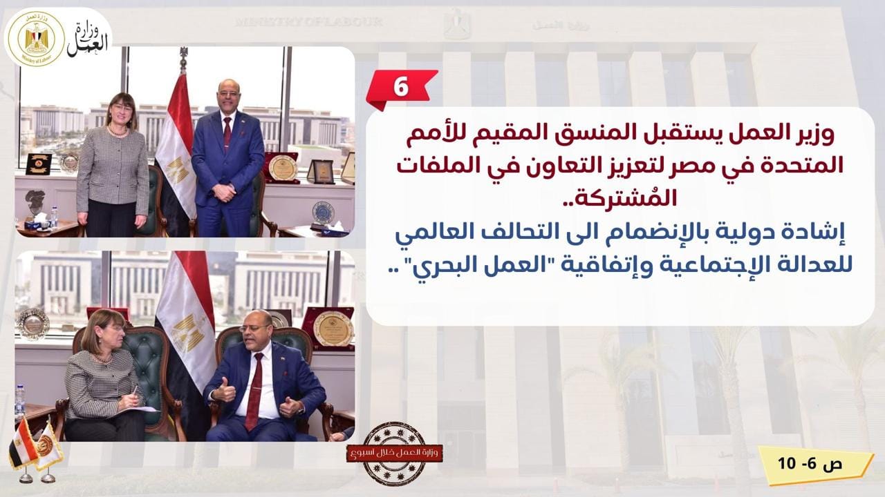 وفي إطار تعزيز التعاون الدولي، استقبل وزير العمل بمكتبه بالعاصمة الإدارية الجديدة، السيدة إيلينا بانوفا المنسق المقيم للأمم المتحدة في مصر، وذلك للبحث والتنسيق في الملفات المشتركة، حيث رحب الوزير بمسؤولة الأمم المتحدة، مُستعرضًا الجهود التي تبذها الوزارة في مجالات العمل.