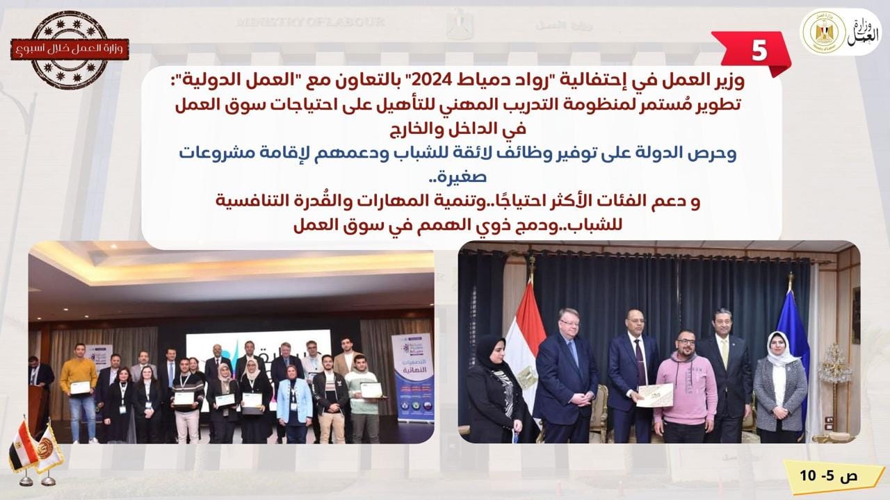 جاء ذلك خلال كلمة الوزير في إحتفالية نهائيات مسابقة رواد دمياط 2024، التي انعقدت في إطار مشروع وظائف لائقة لشباب مصر - معا لتنمية الشباب في دمياط، بالتعاون مع منظمة العمل الدولية بالقاهرة، وبدعم من الشركة المصرية ميثانيكس لانتاج الميثانول بدمياط،وبالشراكة مع عددِ من الجهات الوطنية،منها جهاز تنمية المشروعات المتوسطة والصغيرة ومتناهية الصغر،والمجلس القومي للمرأة.