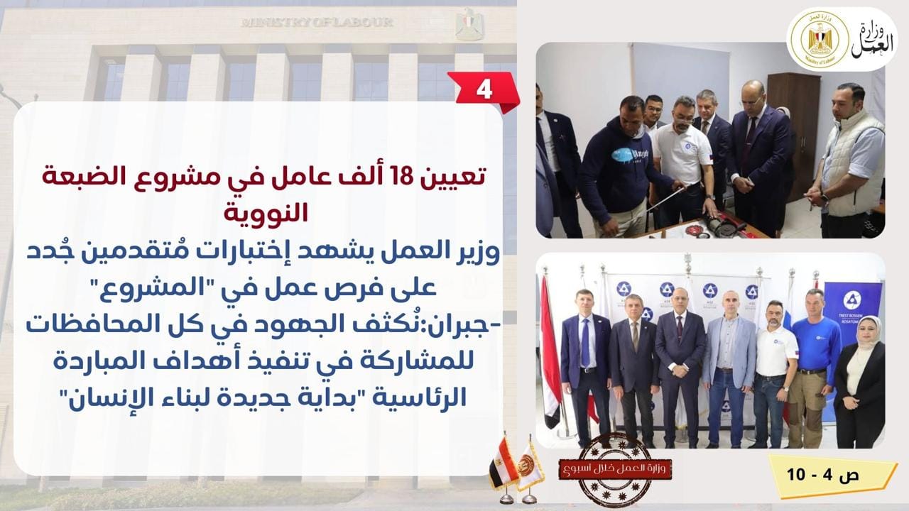 وفي نفس السياق شهد وزير العمل، اختبارات عددِ من المُتقدمين على فرص العمل التي أعلنت عنها الوزارة، منذ أيام،للعمل في بعض المهن المطلوبة بمشروع الضبعة النووية، بمحافظة مرسى مطروح، حيث انعقدت الإختبارات بمقر الوزارة القديم بمدينة نصر، لاختيار 6200 عامل تحتاجهم شركات عاملة في المشروع.