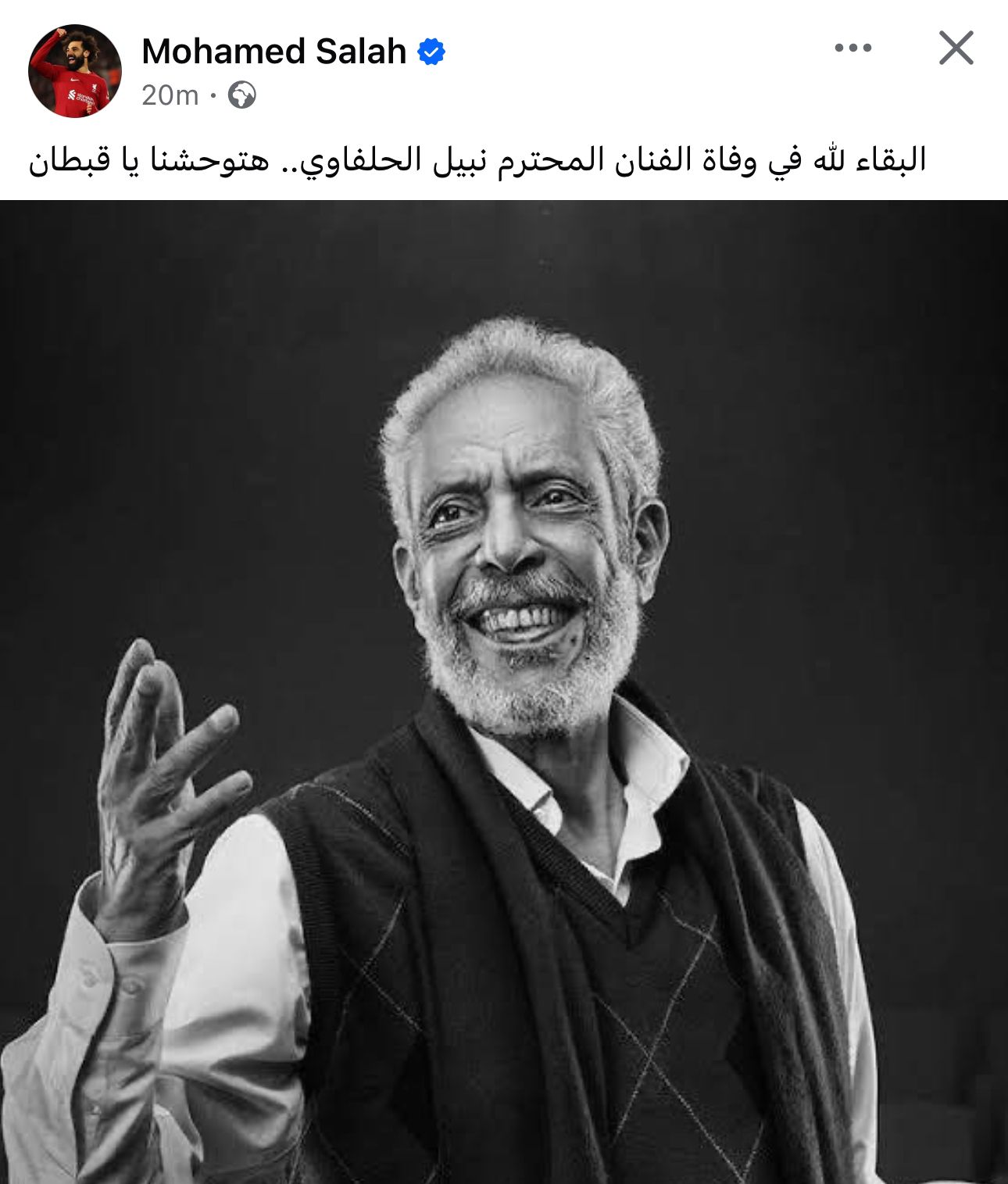 ونشر محمد صلاح عبر صفحته الرسمية على "فيسبوك" صورة للنجم الراحل نبيل الحلفاوي معلقاً عليها: "البقاء لله في وفاة الفنان المحترم نبيل الحلفاوي… هتوحشنا يا قبطان".