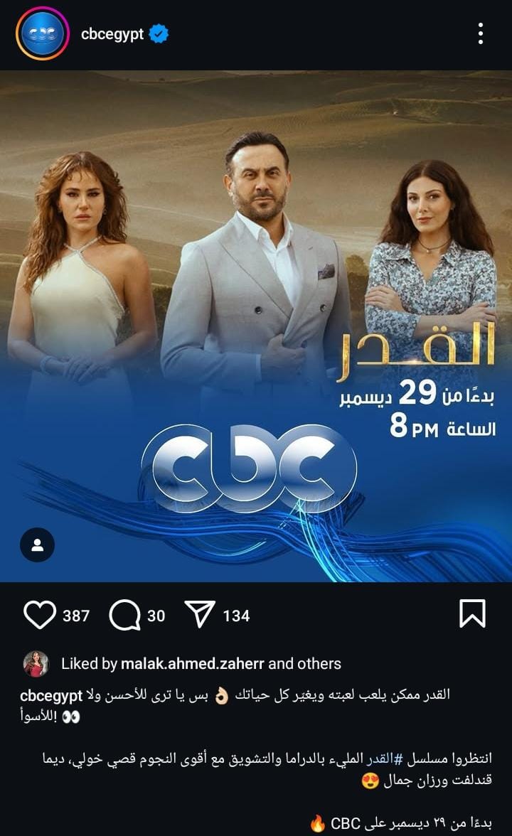 وأضافت: “ انتظرو مسلسل القدر الملئ بالدراما والتشويق مع أقوي النجوم قصي خولي، ديما قندلفت، رزان جمال، بدءا من 29 ديسمبر علي CBC”.